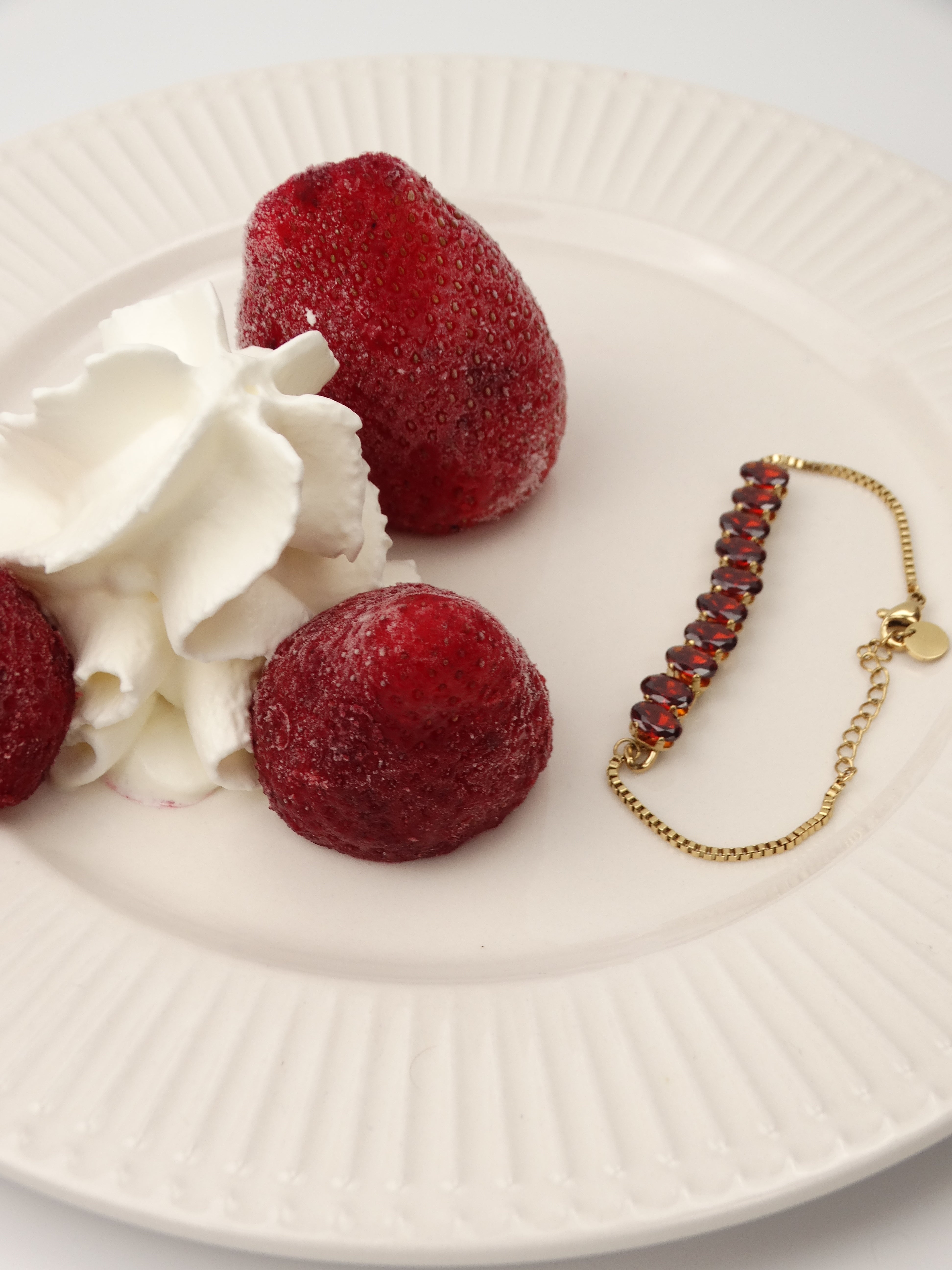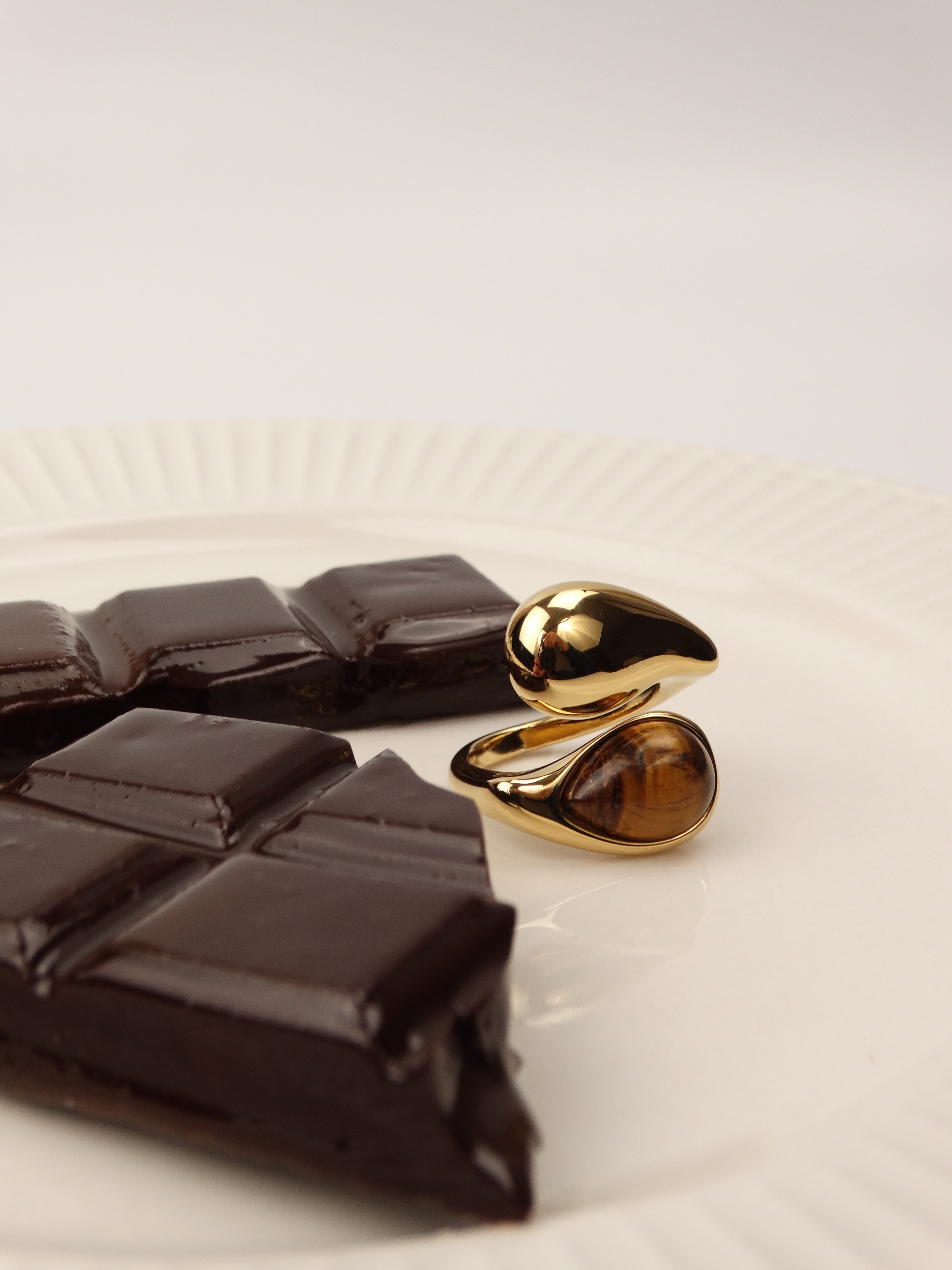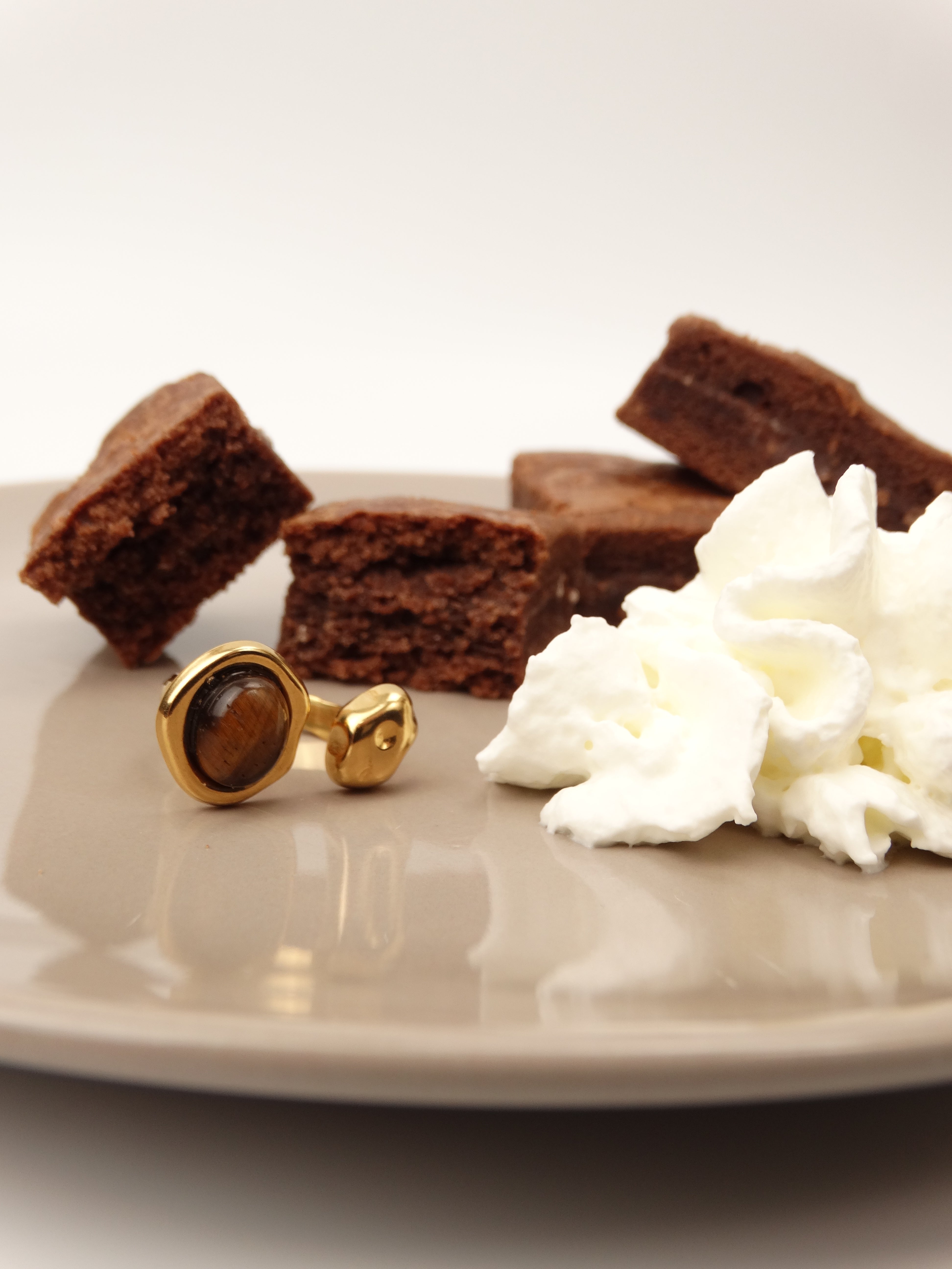 Chaque pièce évoque une gourmandise : un éclat de caramel, une mousse onctueuse, une touche de ganache ou une cerise confite. Les formes rondes et les finitions satinées rappellent les douceurs des vitrines tandis que les détails minutieux rappellent le travail d’un chef pâtissier.